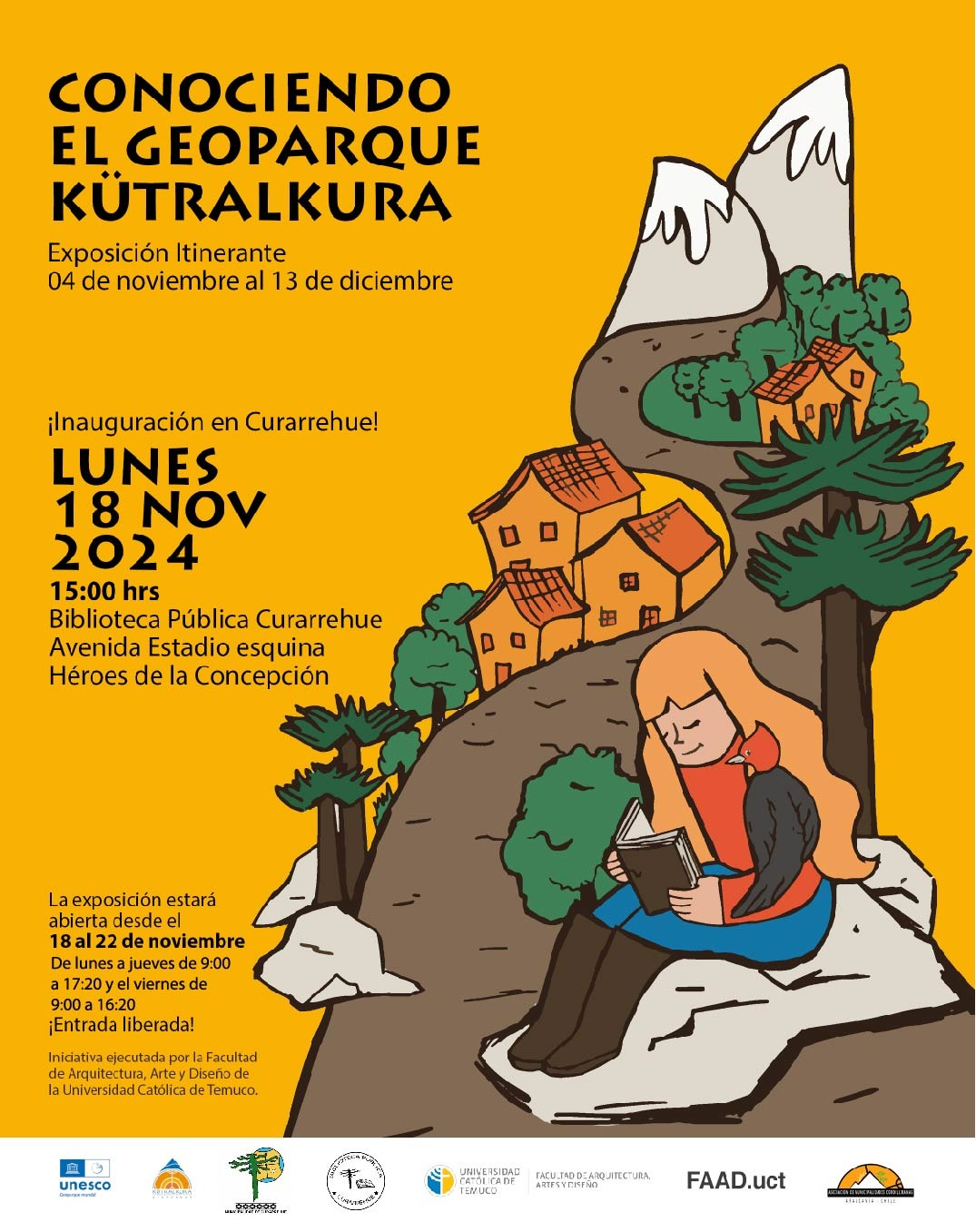 La Municipalidad de Curarrehue junto a la Biblioteca Pública Municipal, tienen el agrado de invitar a la Comunidad a la Exposición Itinerante “Conociendo el Geoparque Kütralkura”. Esta se desarrollara desde el 18 al 22 de noviembre 2024, de lunes a jueves de 09:00 a 17:20 y viernes de 09:00 a 16:20 hrs. Quedan cordialmente invitados a explorar y aprender sobre nuestro patrimonio natural. Dudas y /o Consultas dirigirse a Biblioteca.